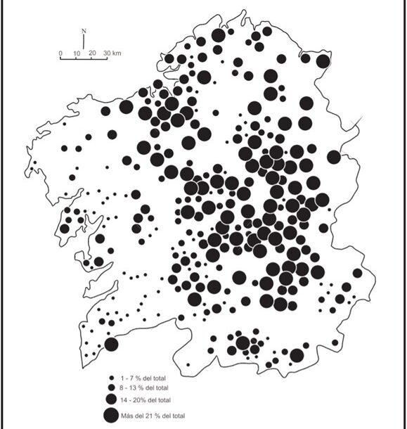 Map showing the distribution of households with servants in Galicia in the mid-18th...