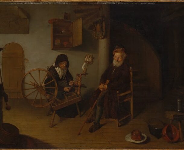 Domestic interior with a spinner, doing her work, accompanied by a...