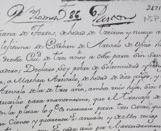 Memorial made by Josefa Navarro, widow of Bernardo de Moya, informing of her family and patrimonial state. Josefa declares that she is 50 years old and a widow, as well as having 3 sons: Bernardo de Moya, 26 years old and servant boy of sheep herdsman; Sebastián, 15 years old, shepherd; and Juan, 13 years old, blacksmith. The whole family is serving Cristóbal de la Torre. After explaining his family situation, he provides the goods he has: a house in the parish of San Francisco in Villarrobledo, consisting of multiple rooms; livestock in the form of 5 sheep, 7 goats, 13 goats’ laps and 1 lamb.